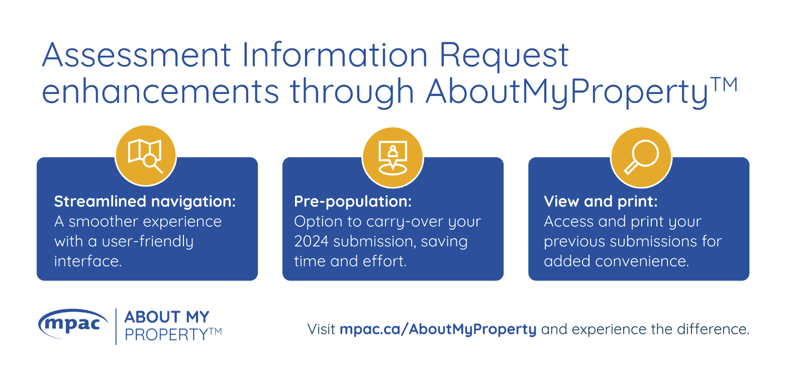 MPAC introduces information request portal enhancement in AboutMyProperty™ The Property Income and Expense Return is their largest information request campaign, where MPAC requests rental, income and expense information from income-generating properties such as retail stores, hotels, motels, multi-residential properties, golf courses and offices. Starting May 20, eligible property owners will receive an information request letter from MPAC outlining what information is needed and details on how to submit it. The submission deadline is July 14, 2025. This year, MPAC has made it easier than ever to provide information online through AboutMyProperty. The enhanced information request portal offers: