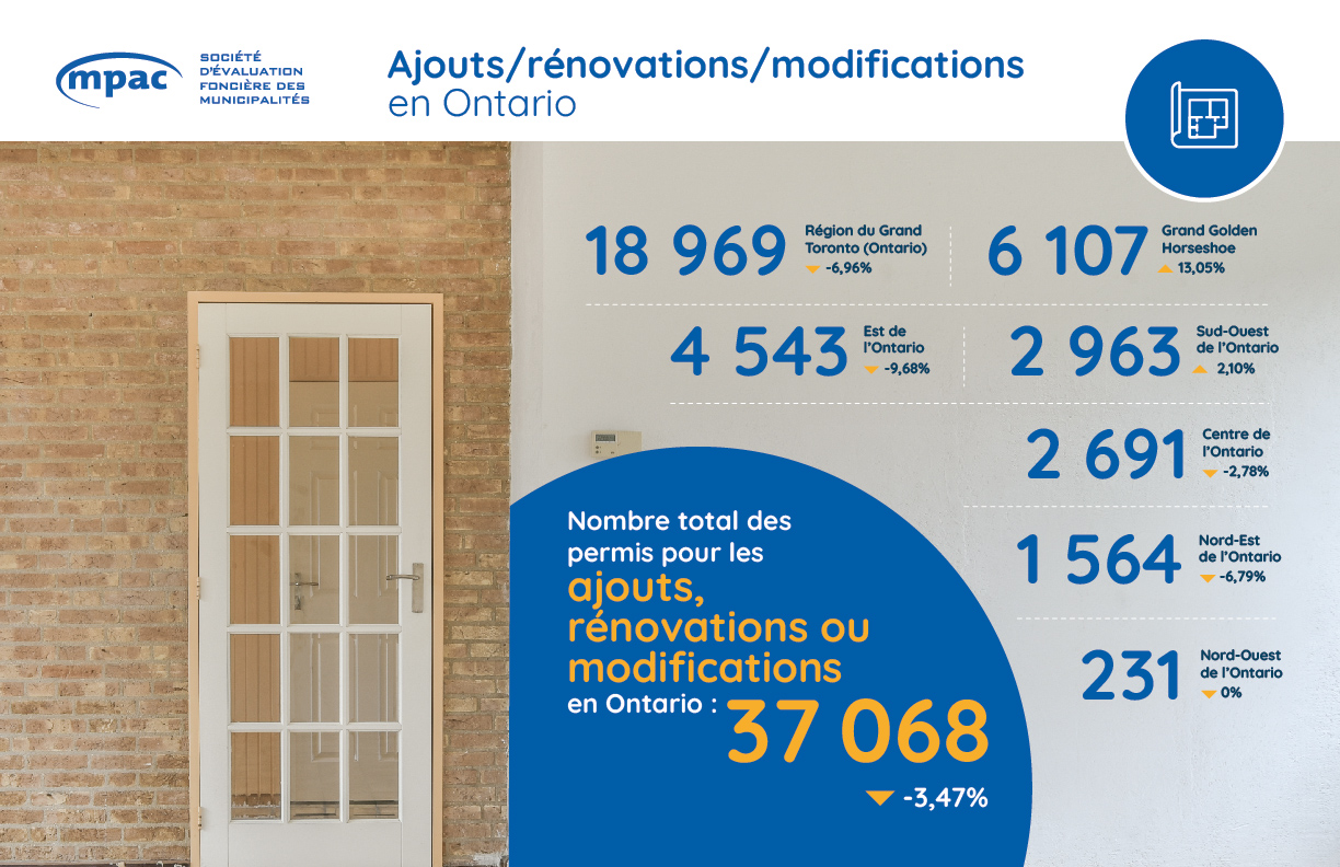 La Société d’évaluation foncière des municipalités (SEFM), qui suit les données foncières dans tout l’Ontario, signale que les permis d’améliorations domiciliaires ont diminué de plus de 9 % en Ontario, pour atteindre plus que 63 000. Ces permis visaient les améliorations domiciliaires, y compris les rénovations, les piscines, les remises, les garages et les terrasses. Malgré une diminution par rapport à l’année précédente, les permis sont toujours en hausse de 22 % par rapport aux niveaux antérieurs à la pandémie de 2019 (51 597 permis délivrés).
